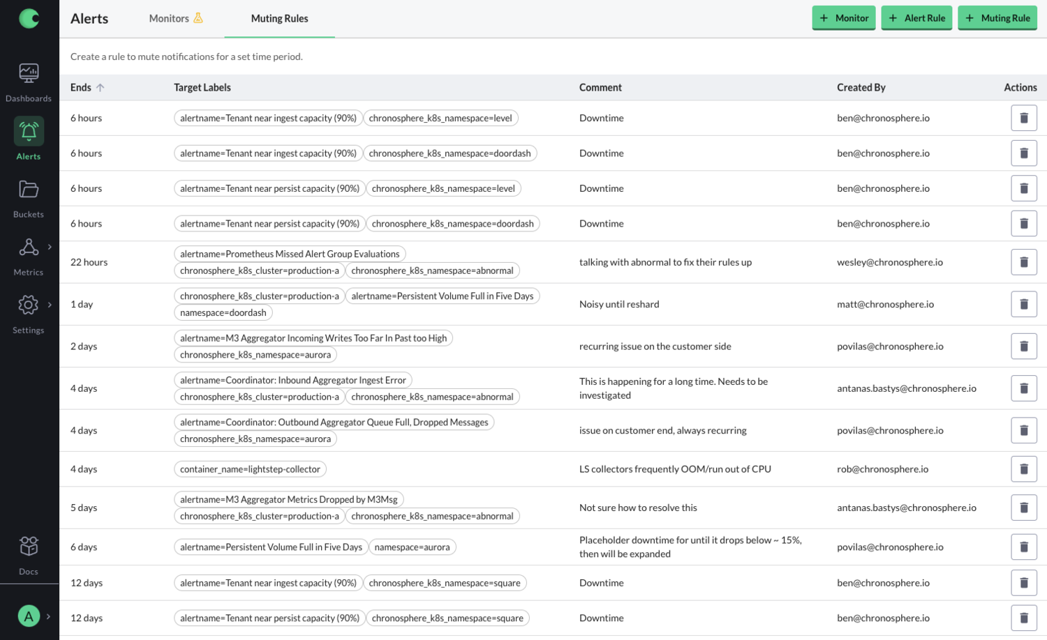 Chronosphere is provided as a hosted service which eliminates the need to manage a monitoring infrastructure while still maintaining compatibility with cloud-native standards like Prometheus, PromQL and Grafana Dashboards.