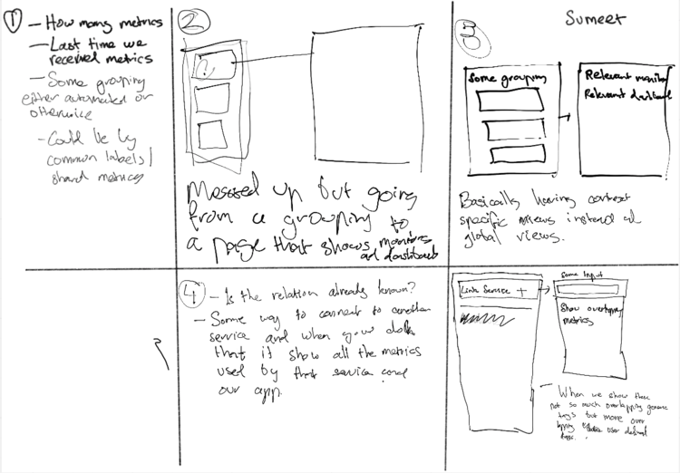 Chronosphere is a product created by engineers for engineers. I utilized my teammates as much as possible for design ideas since they had a lot of product knowledge, applicable experience, and opinionated ideas. Throughout the project, I hosted many design studios with the team. We regularly utilized the “Crazy 8s” method to quickly generate ideas and collaborate on our path forward. Since the sky was truly the limit on this project, I structured our design studios with clear goals and expectations to keep the ideas on track.